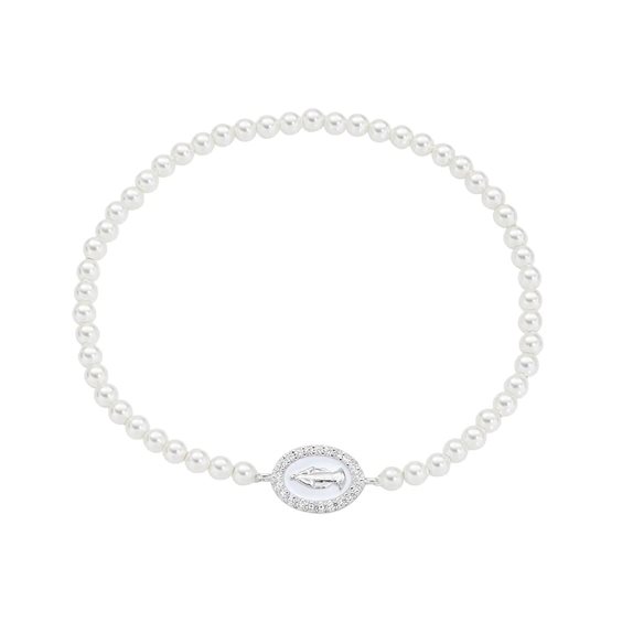 Bracciale in AG925 con perle, smalto bianco perla e zirconi bianchi - Rodiato - Lungh. 17 cm - charm 8 x 11 mm - perle Ø 3 mm