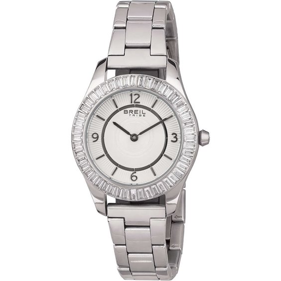 Orologio solo tempo della Collezione Meghan di Tribe. Movimento Miyota 2025, cassa in acciaio lucido con lunetta con cristalli taglio baguette. Quadrante bianco con ring centrale, vetro minerale, bracciale in acciaio lucido, chiusura con pulsanti