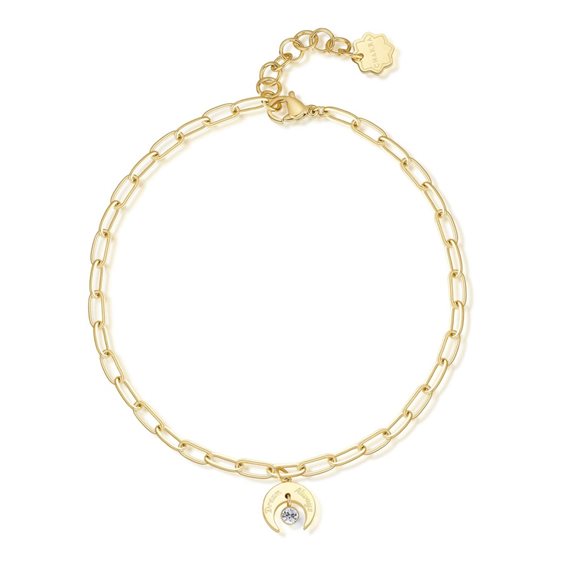 LUNA CRESCENTE: CRESCITA, SCELTA, POSITIVITÀ INCISIONE: Dream always (fronte) La luna crescente è la fase in cui si ha voglia di fare e di osare, si delineano nuovi obiettivi, si affrontano sfide e si fanno scelte importanti per la propria vita. È un simbolo di energia che infonde benessere e positività. Cavigliera in acciaio 316L, finitura color oro con pendente a forma di luna con incisione e cristallo crystal