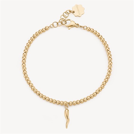 BUON AUSPICIO, FORZA, PROTEZIONE La sua simbologia è diffusa in tutte le civiltà. Avere un corno portafortuna, lungo e affusolato, sprigiona fortuna e benessere a tutta la famiglia e le generazioni future. Bracciale con sfere in acciaio 316L e finitura pvd oro 14K, con pendente a forma di cornetto.