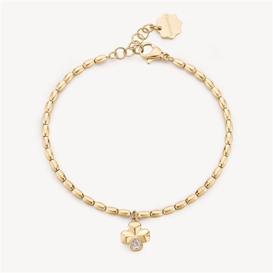 FORTUNA, POSITIVITÀ, SUCCESSO Simboli di buona sorte regalano protezione e positività. Le difficoltà che si affrontano nella vita non sono nulla in confronto alla gioia del successo. Buona fortuna! Bracciale con sfere in acciaio 316L e finitura pvd oro 14K, con pendente a forma di quadrifoglio e cubic zirconia.