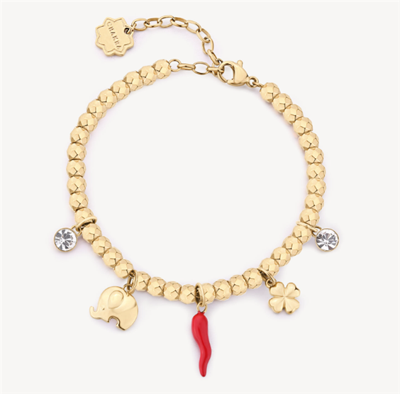 BUON AUSPICIO, FORZA, PROTEZIONE La sua simbologia è diffusa in tutte le civiltà. Avere un corno portafortuna, lungo e affusolato, sprigiona fortuna e benessere a tutta la famiglia e le generazioni future. Bracciale con sfere in acciaio 316L, finitura pvd oro 14K e pendenti con elefante, quadrifoglio, cornetto con smalto rosso e cristalli.