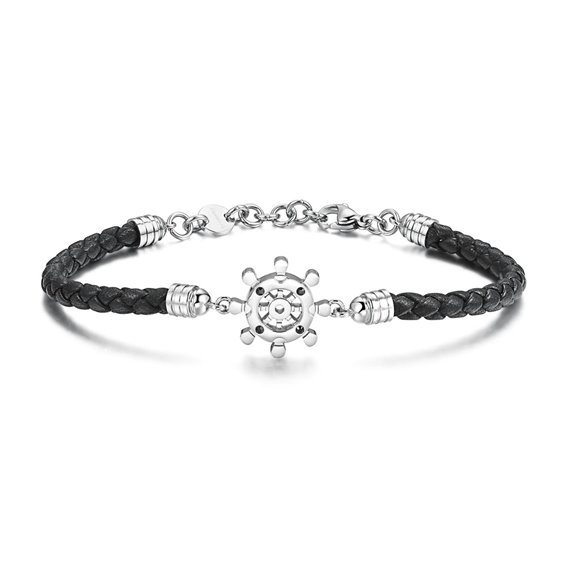 Bracciale in pelle intrecciata nera con centrale in acciaio 316L a forma di timone e cristalli Swarovski©jet