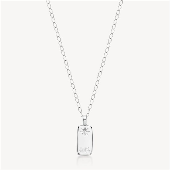 Collana lunga in acciaio 316L e pendente con incisione "LUCK" e cristallo.