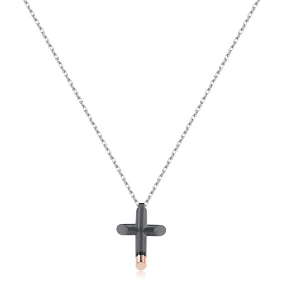 Collana uomo Brosway gioielli - collezione Celesta - CODICE: BCS02. Collana comfort fit in acciaio 316L con pendente a croce in grey gun satin pvd, finiture rose gold pvd e dettaglio smaltato color nero. Lunghezza massima girocollo: 48 cm - lunghezza croce: 2.40 cm. FINITURE: smalti, oro rosa, gun.