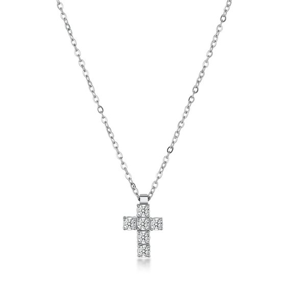 Collana girocollo in acciaio 316L, con pendente a forma di croce e cubic zirconia. Misura collana 49 cm. Chiusura a moschettone. Misura pendente 1,3 cm x 1 cm.