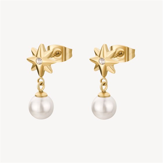 Orecchini in acciaio 316L e finitura pvd oro 14K a forma di rosa dei venti, con perle di conchiglia e cristalli.