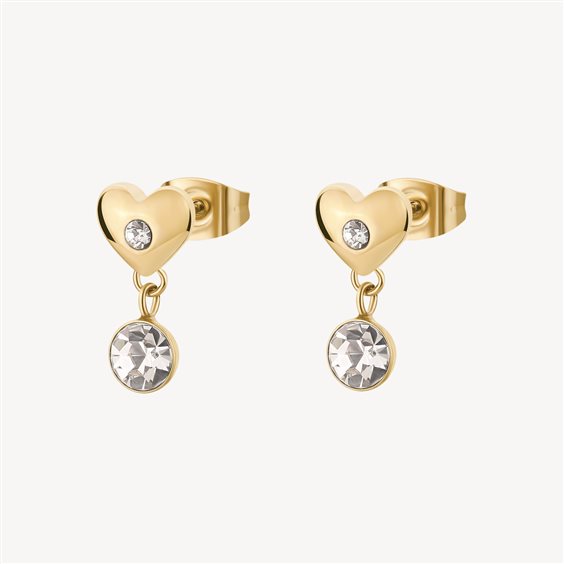 Orecchini in acciaio 316L e finitura pvd oro 14K a forma di cuore e cristalli.