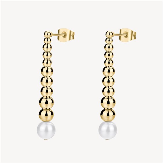 Orecchini pendenti in acciaio 316L e finitura pvd oro 14K, con perla di conchiglia.