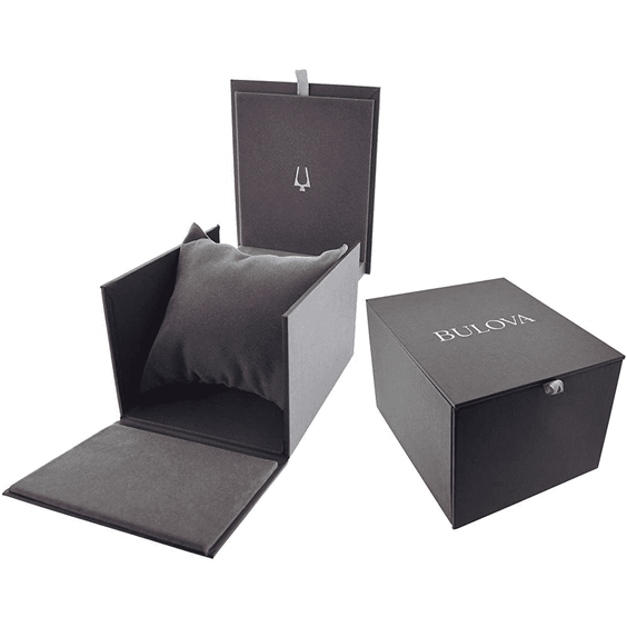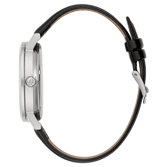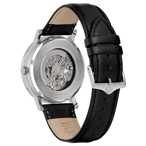 L'orologio da uomo Bulova monta una cassa in acciaio da 42 mm di diametro e 11 mm di spessore e un vetro minerale che protegge il quadrante silver scheletrato al centro. Il cinturino è in pelle nera. In questo modello il fondello è a vite con oblò trasparente e lascia a vista il Movimento Automatico Bulova 21 Jewels.