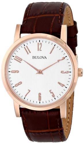 Dalla Collezione Classsic. In acciaio inox con finitura color oro rosa, quadrante bianco-argento lavorato a spina di pesce, cassa con profilo sottile, e cinturino in pelle marrone.
