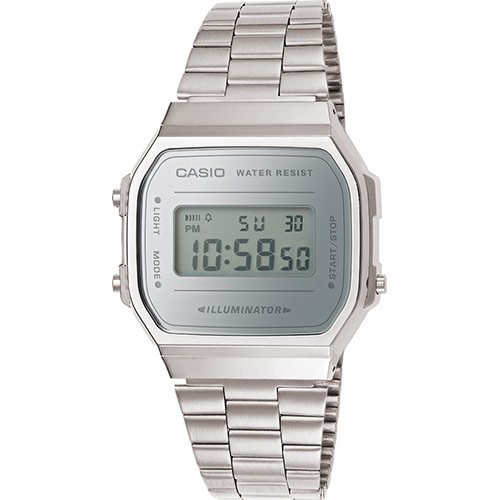 Orologio Casio Collection Vintage da uomo e da donna con movimento al quarzo analogico. Quadrante a specchio. Illuminazione, cronometro - 1/100 sec - 24 ore, allarme giornaliero, calendario automatico, formato 12/24 ore. Cassa (38.6 x 36.3 mm) in resina e bracciale in acciaio 316L con chiusura regolabile. La batteria alimenta l'orologio per circa 7 anni.