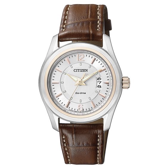 Orologio da donna, cinturino pelle stampata marrone, quadrante silver con indici rosati con datario. Movimento Eco-drive