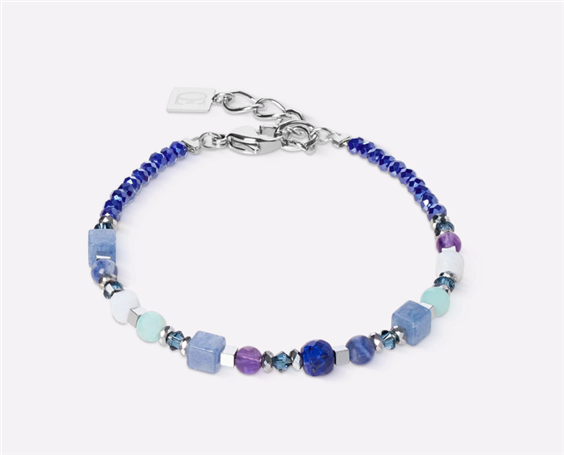 MATERIALE: Lapislazzuli Calcedonio Amazzonite Sodalite Aventurina blu Agata Cristalli Swarovski® Vetro molato LUNGHEZZA: 18 cm + 3 cm catenella di prolunga FORZA: 0.4 cm BLOCCO: Chiusura a moschettone acciaio inox Bracciale Shape Mix Spikes Blue Moon Il bracciale Shape Mix Spikes Blue Moon riflette tutta la profondità della tendenza cromatica HW Blue Moon. Lapislazzuli, amazzonite, calcedonio, avventurina blu, sodalite e agata sono combinati con cristalli Swarovski® sfaccettati per creare un gioco armonioso di colori che vanno dall'azzurro tenue al misterioso Future Dusk. Ogni pietra naturale varia per grana e intensità, rendendo ogni bracciale unico. Realizzato con cura a mano, è un compagno di stile che unisce modernità ed eleganza.