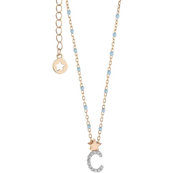 Collana Da Donna Di Comete Delle Collezione Stella. Girocollo In Argento 925% Con Trattamento Di Doratura Rosè E Smalto Azzurro, Zirconi Bianchi. All'Interno Della Confezione C'È La Dedica:La Tua Lettera Portafortuna. Dimesioni:Lunghezza Massima Collana 42 Cm. Con Possibilità Di Partenza 37,5 Cm. Diametro Catena/Smalti Ø 1,40Mm. Larghezza 6,00Mm. Lunghezza 8,50Mm. Lunghezza Compresa Contromaglia Stella 12,40Mm. Spessore 1,60Mm. La Referenza È Gla 175