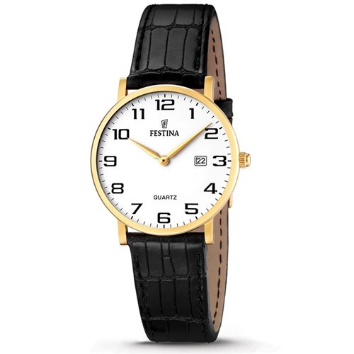 Orologio donna , cassa in acciaio placato in oro giallo , movimento al quarzo, cassa mm 31 , fondello a pressione , vetro minerale , quadrante bianco con numeri neri , datario , cinturino in pelle stampato nero.