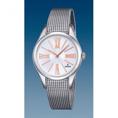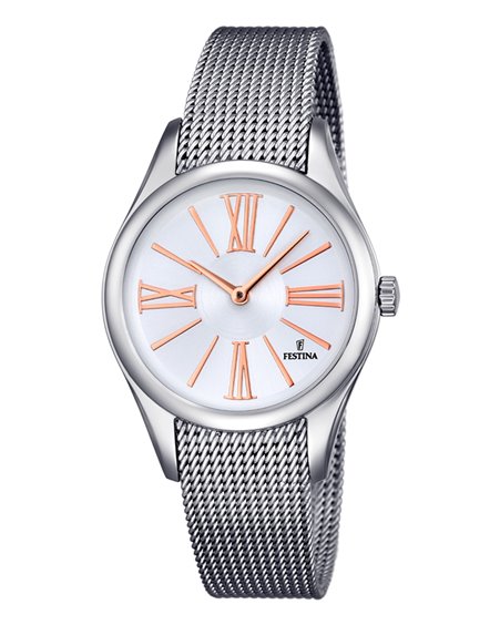 Orologio solo tempo da donna , Cassa Acciaio , Diametro 34 Mm. Quadrante argentato indici rose gold, cinturino acciaio maglia milano. Resistenza All’Acqua 5 Atmosfere, meccanismo al quarzo.