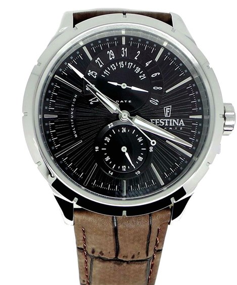 FESTINA ELEGANCE UOMO MOVIMENTO: MYOTA quarzo giappone prima scelta FUNZIONI: circolare data a ore 12/ 12/24 ore a ore 6 CARATTERISTICHE: cassa in acciaio cinturino in morbida pelle/ vetro minerale/ WR 5atm/ lancette luminose DIMENSIONI: diametro cassa mm 45
