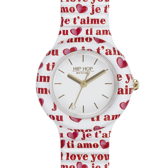 L’orologio Hip Hop Heart & Love è una vera e propria dichiarazione d’amore! Cosa c’è di più universale della frase TI AMO, stampata in diverse lingue lungo tutto il cinturino in morbido silicone?