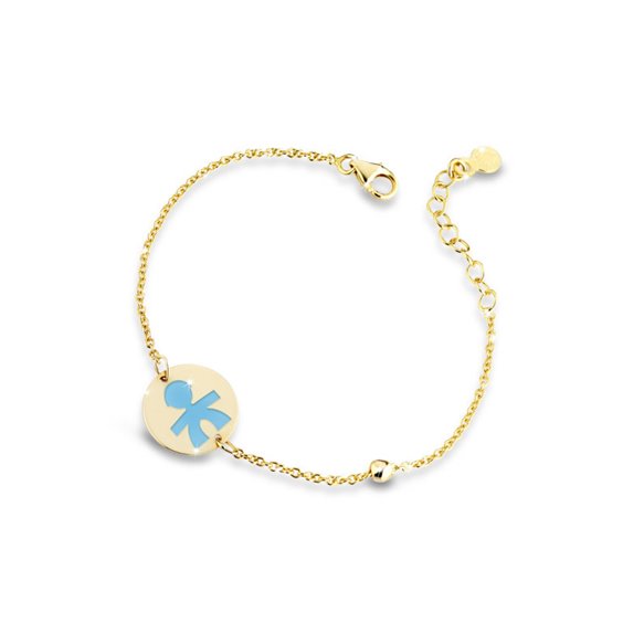 Bracciale in oro giallo con targhetta tonda sagoma maschietto in smalto azzurro. La maglia rollò in oro giallo ha una pallina in oro giallo. Tutti i gioielli della linea le Bebé possono essere personalizzati.