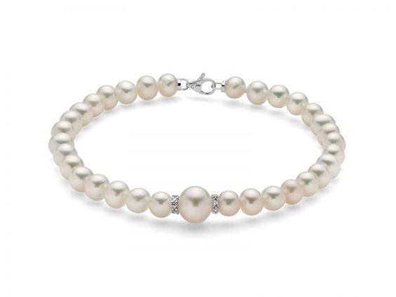 Bracciale filo di perle d'acqua dolce 7,5 - 8 colore bianco ideato e realizzato da Miluna, il bracciale è impreziosito da sei diamanti di carati totali 0,02 colore G purezza SI taglio brillante rotondo, lunghezza 18 centimetri, chiusura a moschettone.