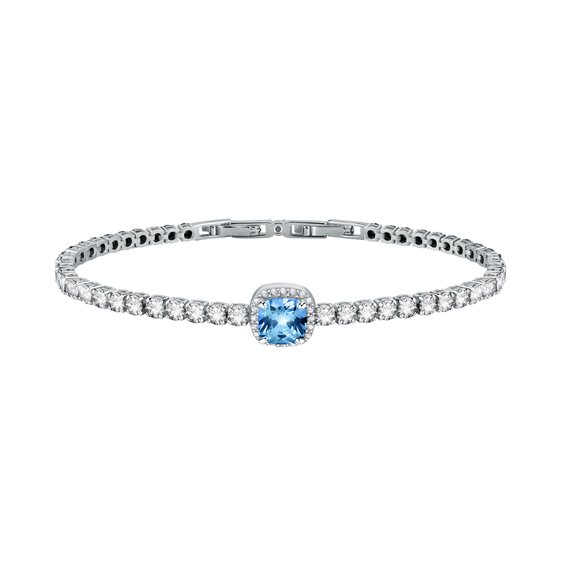 Bracciale tennis donna di Morellato della collezione Tesori. Gioiello realizzato in argento 925‰ e zirconi di colore azzurro/bianco. Misura bracciale : 16+1.75cm. Chiusura a scatto. La referenza è SAIW112 Questo bracciale verrà spedito con Scatola Originale Morellato