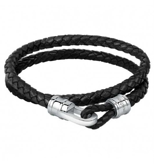 Bracciale in cuoio nero intrecciato a doppio giro con chiusura in acciaio.