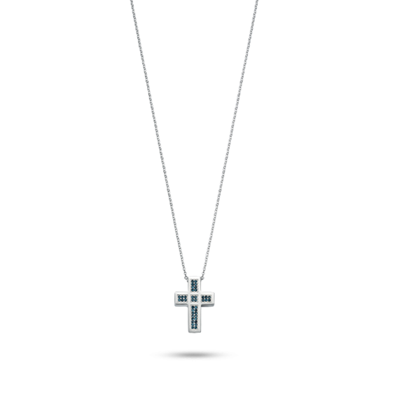 CATENA E CROCE IN ACCIAIO, LUNGHEZZA REGOLABILE. CROCE CON PIETRE STRASSE AZZURRI