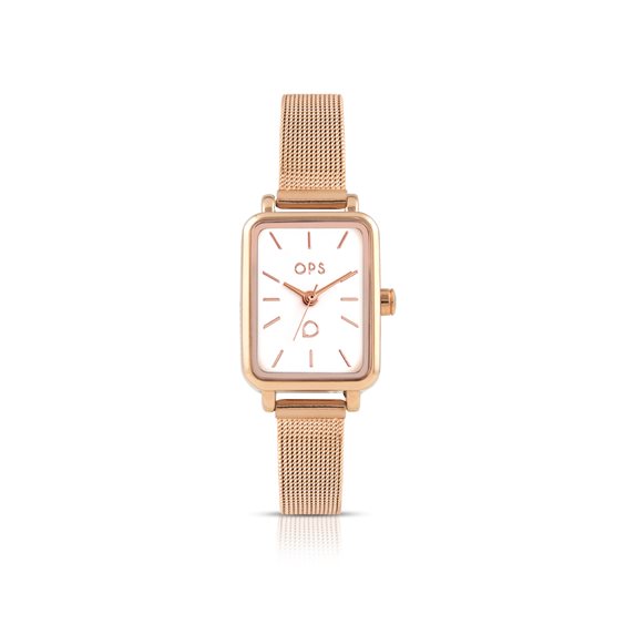 Cassa in metallo 20 x 26 mm e trattamento PVD oro rosa. Quadrante lucido o madreperla rosa. Fondello in acciaio. Movimento Y121. Water Resistant 3 atm. Bracciale maglia Milano in acciaio e trattamento PVD oro rosa. Larghezza bracciale: 10 mm. Circonferenza interna del bracciale: da 180 mm a 140 mm. Chiusura a scorrimento in acciaio.