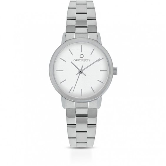 Orologio da donna, Ops Objects, Collezione Hera. Cassa in acciaio da 32 mm, quadrante bianco con indici, bracciale in acciaio lucido con chiusura diver. Resistenza all'acqua di 3 ATM. Movimento Y121.
