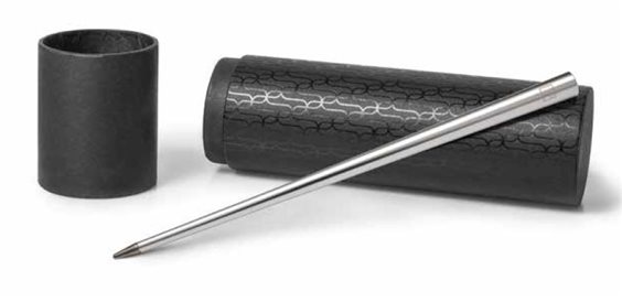 La penna ha il corpo in alluminio e la punta in Ethergraf, in grado di scrivere senza bisogno di inchiostro. Si tratta di una lega di materiali in grado di ossidare a contatto con la carta e lasciare il segno.