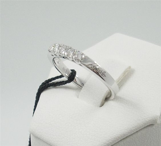 Anello a riviera 5 pietre collezione Maria Teresa realizzato in oro 750‰ per gr. 2.90 con bellissimi diamanti naturali taglio brillante per carati 0.29 complessivi, colore G purezza VS, diametro diamanti 2.69 mm. Si allega garanzia di autenticità che riporta le caratteristiche suddette e assicurazione contro furto, scippo e rapina per 12 mesi offerta in omaggio da Recarlo. Bella confezione regalo come da foto. Misura dell'anello 14.