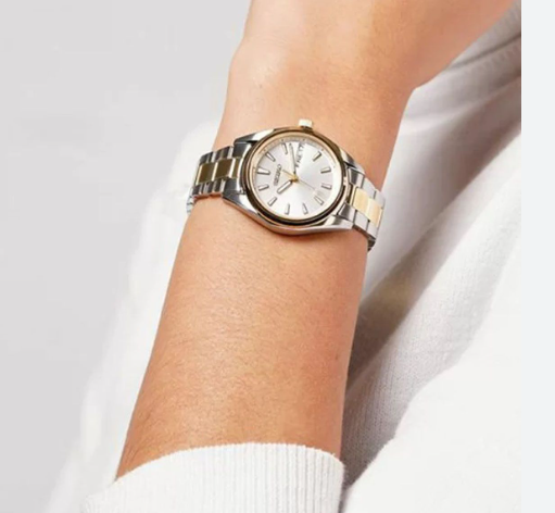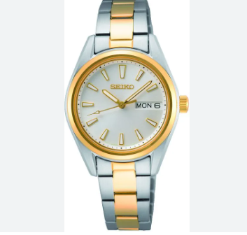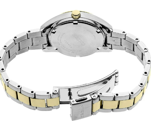 Movimento al quarzo tre sfere,giorno data a ore tre, cassa e bracciale in acciaio inossidabile con trattamento IP oro giallo.Indici e sfere luminosi al buio. vetro zaffiro, water resistant 100 metri