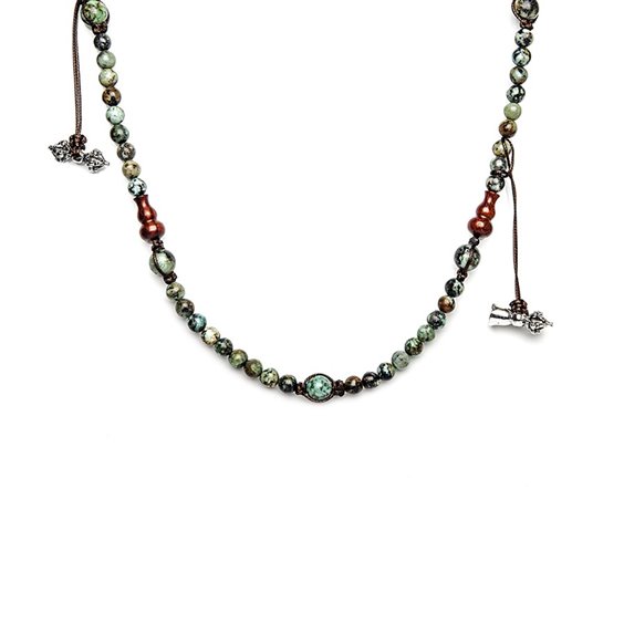 Pietra naturale dai colori dal giallo-verde al verde scuro che può essere ricondotta al Buddha Amoghasiddhi, che ambisce al successo, alla ricchezza e al potere. La tonalità variegata potrebbe suggerire un’ambizione meno competitiva e gelosa. Questo Tamashii trasforma l’orgoglio in saggezza d’identità. Collana Tamashii Mudra Corto originale realizzata con pietre naturali TURCHESE AFRICANO. Composta da 54 grani, completa di Vajra (fulmine) e Ghanta (campana).